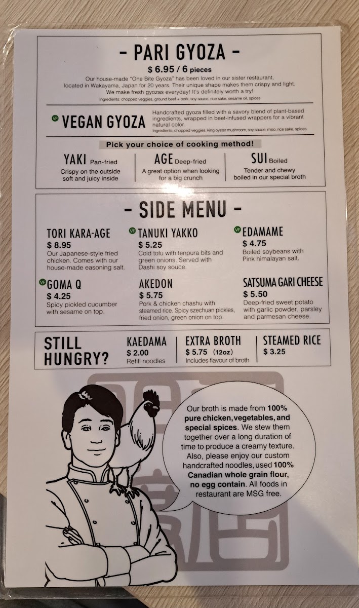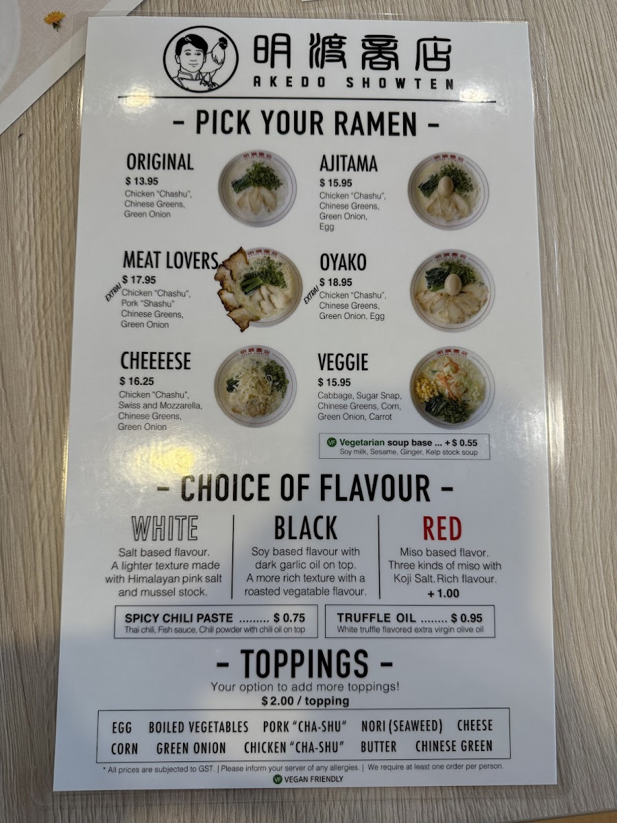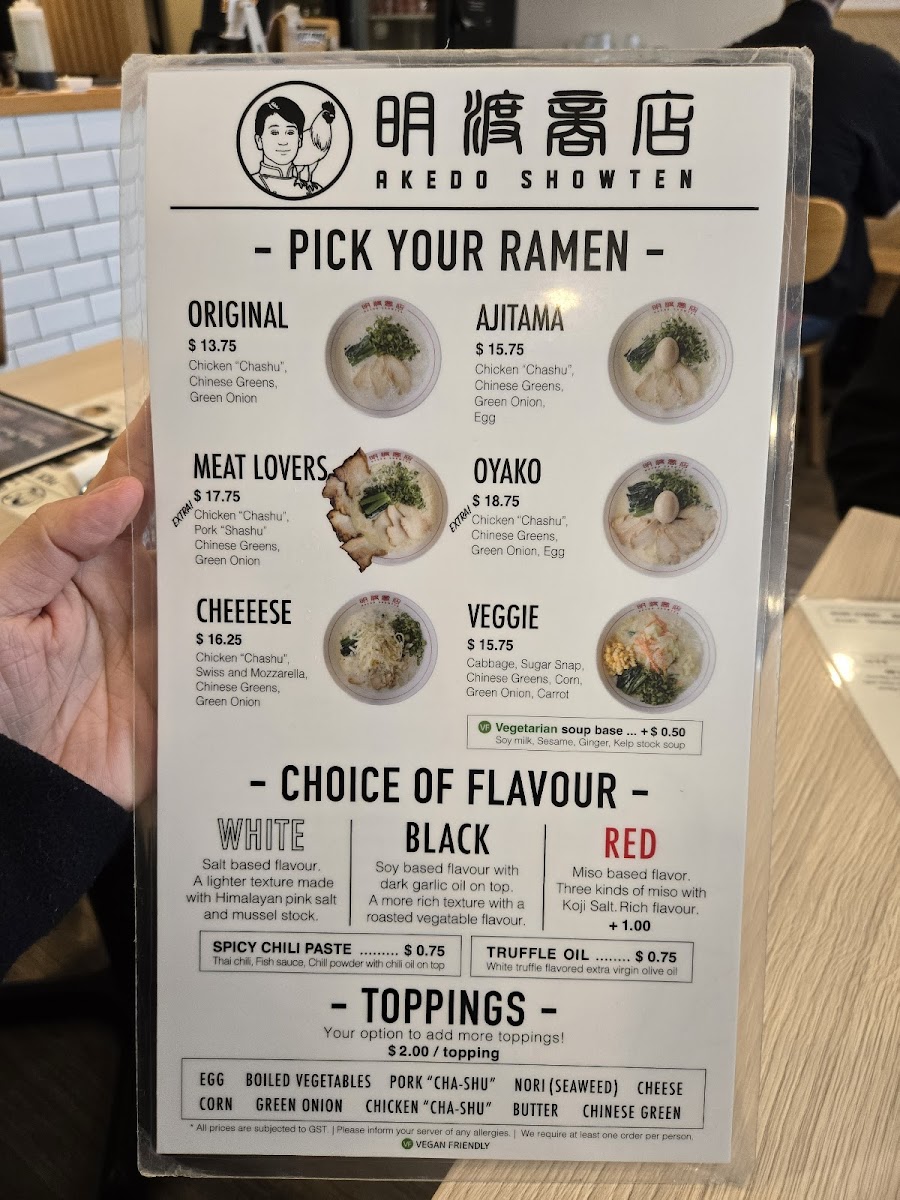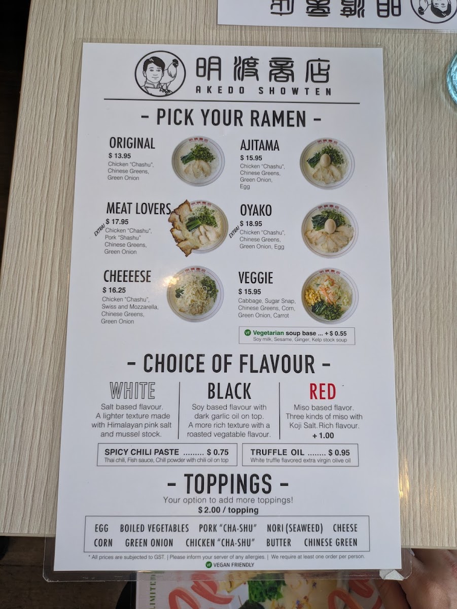 The menu at Akedo Showten RamenGyoza features a selection of Japanese-style dishes centered on ramen and gyoza, catering to a range of tastes including meat lovers, vegetarians, and those seeking traditional Japanese flavors. The ramen offerings include various broths and toppings such as pork and chicken chashu, ajitsuke tamago (seasoned egg), and a variety of vegetables. Signature items include the Ajitama Ramen with Black Flavour, Meat Lovers Ramen, Veggie Ramen, and Oyako Ramen. Customers can also customize their ramen with additional toppings like cheese, corn, nori, and spicy sauces.